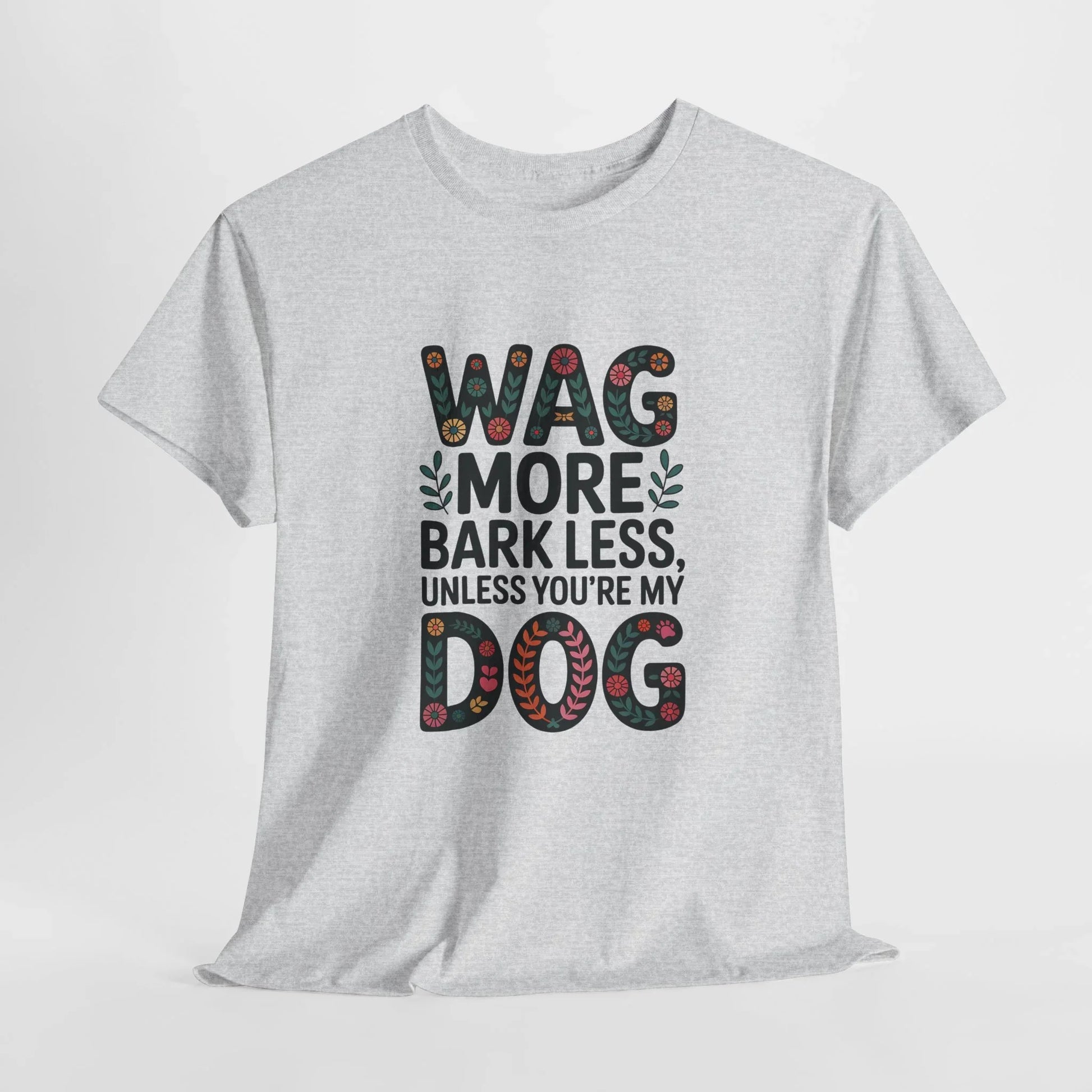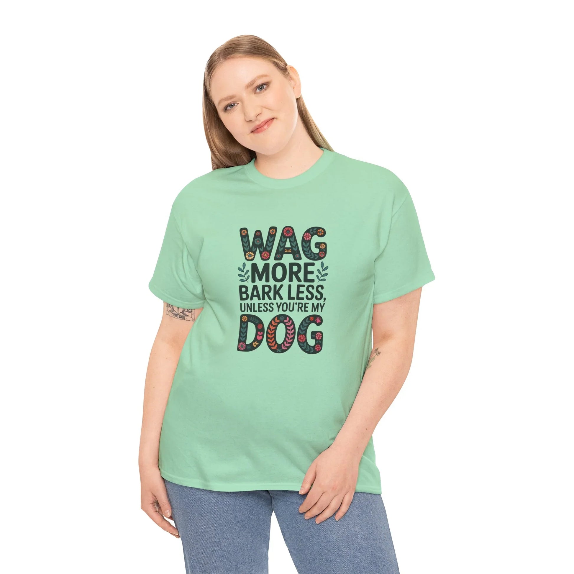 Introducing our Heavy Cotton Tee, perfect for everyday wear and expressing love for your furry friends. This shirt exudes a cheerful vibe, ideal for any dog lover's wardrobe. Whether you're at the dog park, running errands, or cozying up at home, this tee adds a touch of fun and warmth to your look. Designed for adults, it makes a great gift for birthdays, Mother's Day, or just because! Celebrate your connection with your pup and show off your 'Wag More, Bark Less, Unless You're My Dog' title in style. It can also serve as a cute statement piece for casual hangouts or dog-centric events.